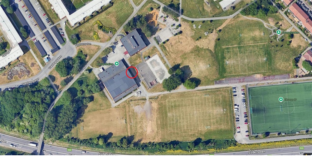 Nu drar inomhussäsongen igång i Ektorpshallen. Den röda ringen i bilden visar var ingången är. Koden till dörren kommer att finnas i kallelsen inför första träningen (alt. ser vi till att någon står vid dörren och släpper in).